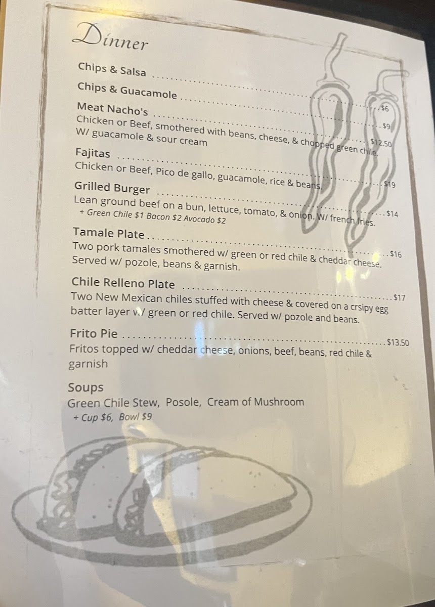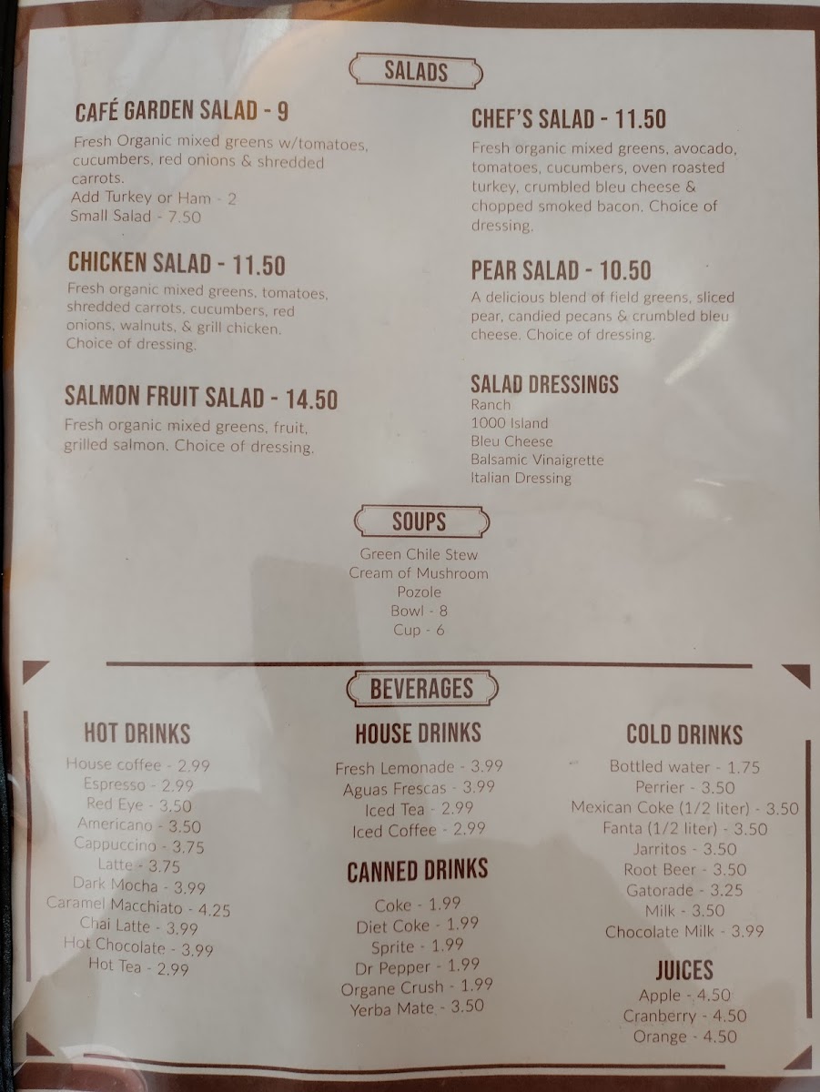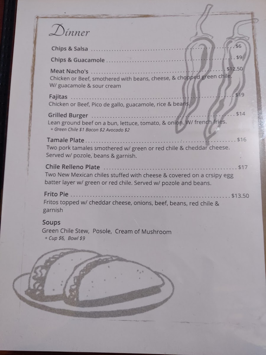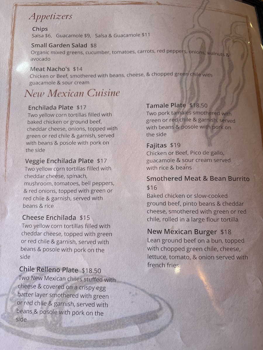 For lunch, the offerings are equally tempting. Guests rave about the Meat Nachos, loaded with chicken or beef, beans, cheese, and fresh green chile, all lavished with guacamole and sour cream for $14.00. Satisfy your craving for lighter fare with the Small Garden Salad, which features organic mixed greens paired with a bounty of fresh veggies for a refreshing $8.00. The Enchilada Plate is another highlight, featuring two savory yellow corn tortillas filled with baked chicken or ground beef, perfect for anyone seeking authentic flavor at a reasonable price.