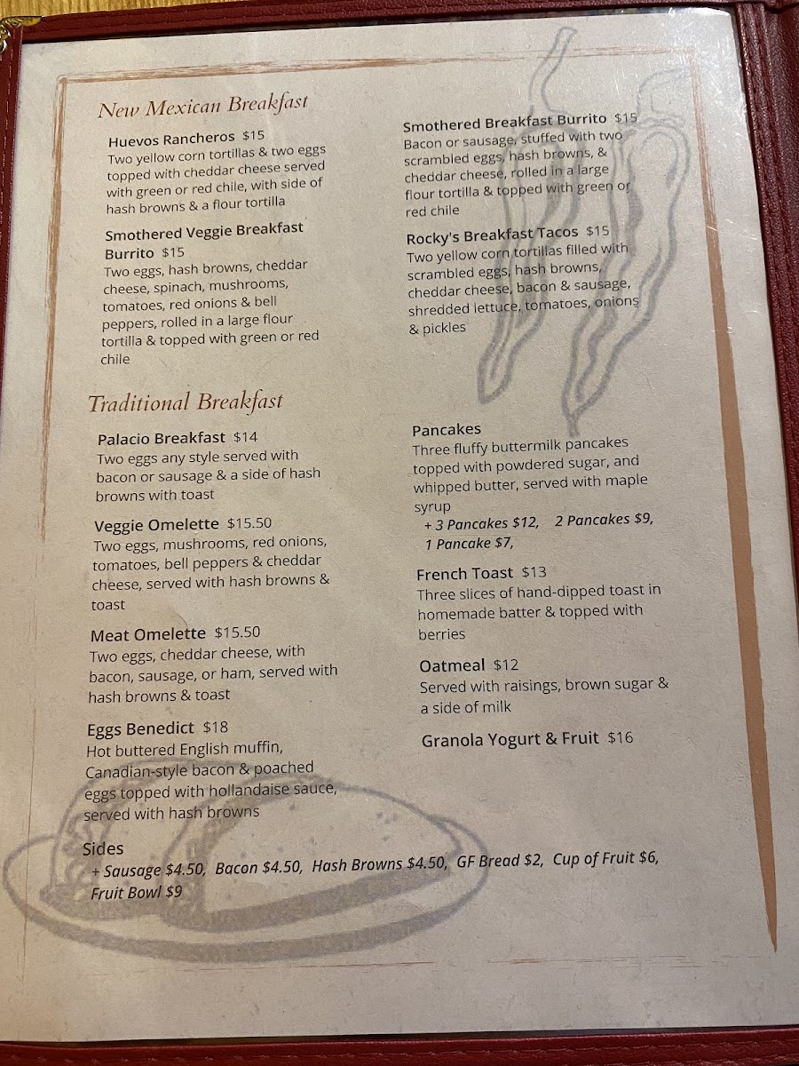 This is one of the few places in the historic core of Sante Fe where you can buy good food at a good price. Not to knock the other places, but the historic core is basically Disney Southwest for the Antiques Roadshow crowd, and the restaurants exist to serve them. At Palacio, they do hearty breakfasts and good coffee to get you fueled up. Service is quick and friendly, and the environment is very pleasant without being a pastiche of Spanish/Mexican. Visited: Mar 2025